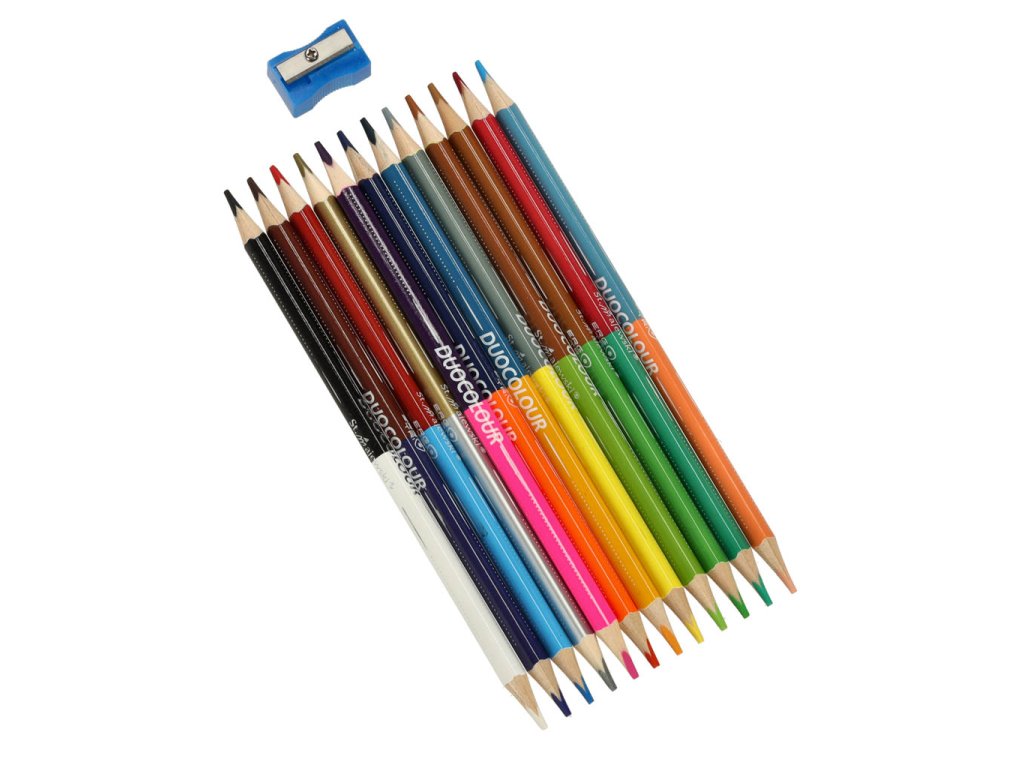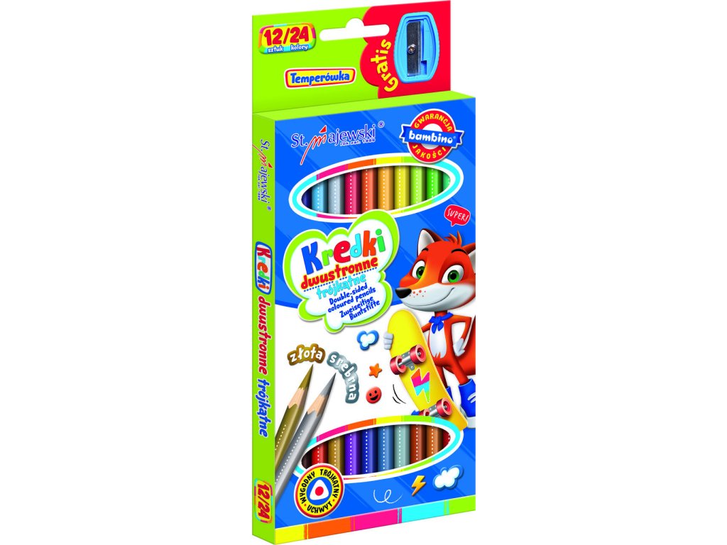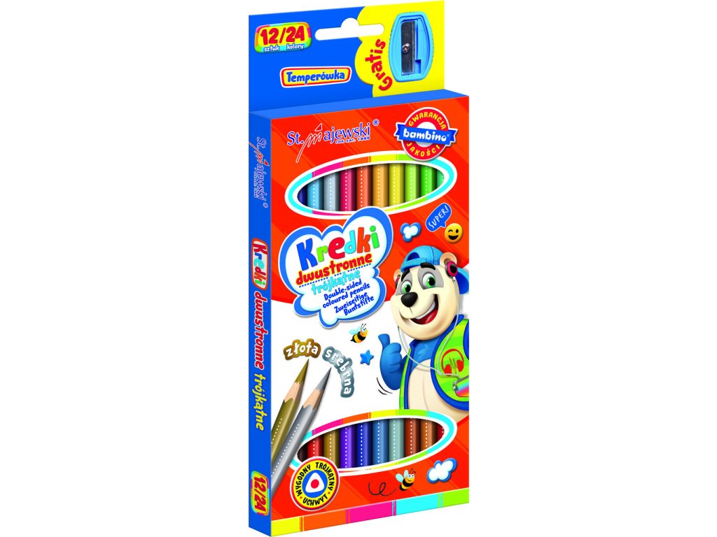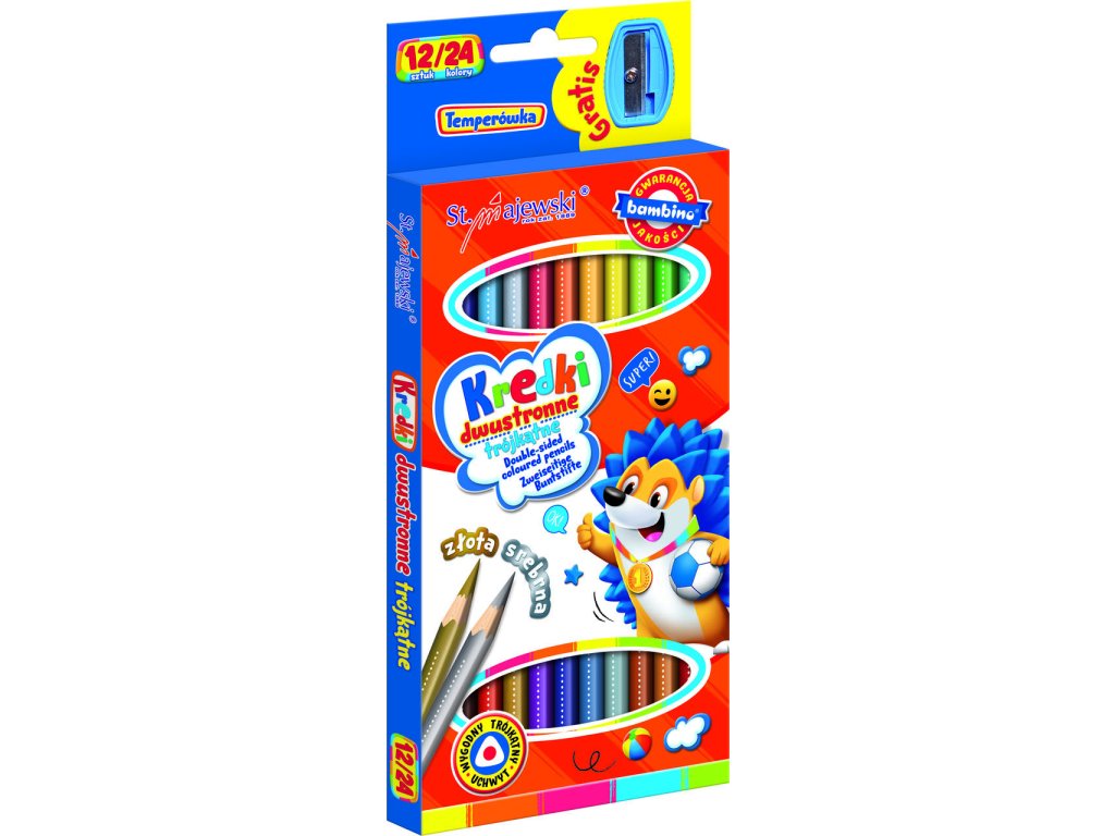 Získajte obojstranné trojuholníkové školské ceruzky so 24 farbami. Kvalitné ceruzky s širokou škálou farieb, zárukou kvality Bambino a bezpečnostným certifikátom. Balenie obsahuje 12 kusov s darčekovým orezávačom. Rozmery: 23 cm x 10 cm x 1 cm.