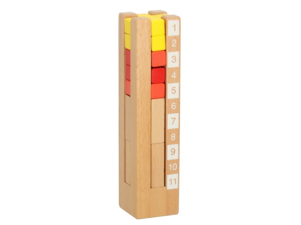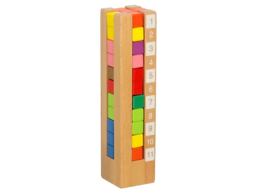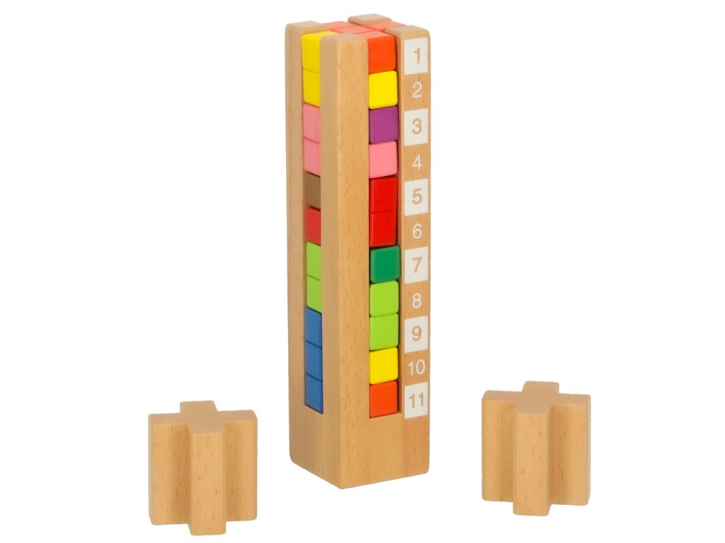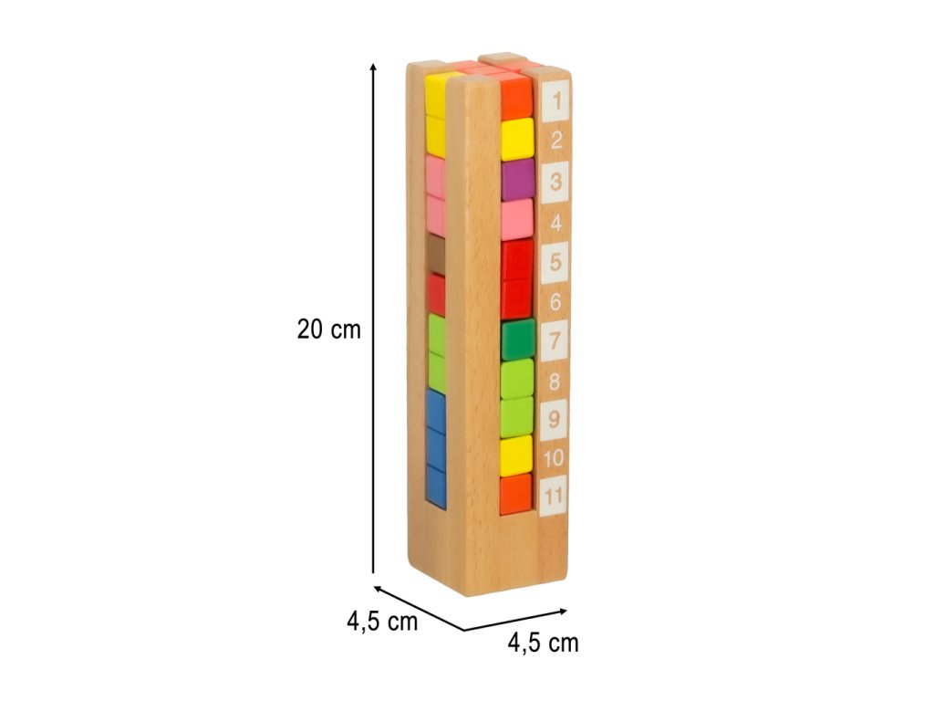 Stavebnica pre deti od 3 rokov z kvalitného dreva. Obsahuje 11 farebných blokov, základňu a 2 kocky. Rozmery veže: 4,5 cm x 4,5 cm x 20 cm. Rozmery balenia: 21 cm x 22,5 cm x 6 cm.