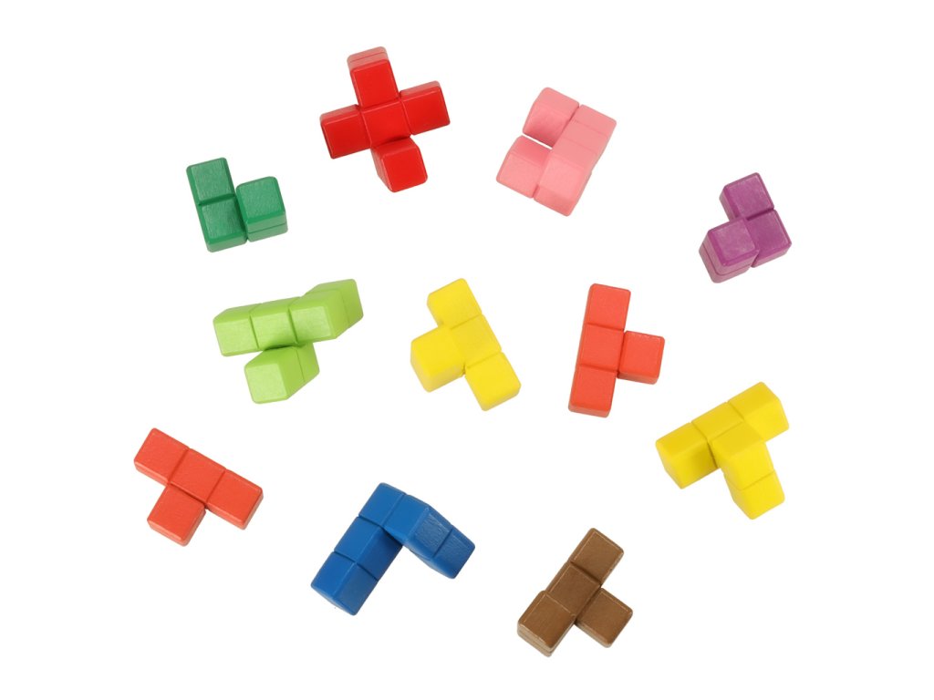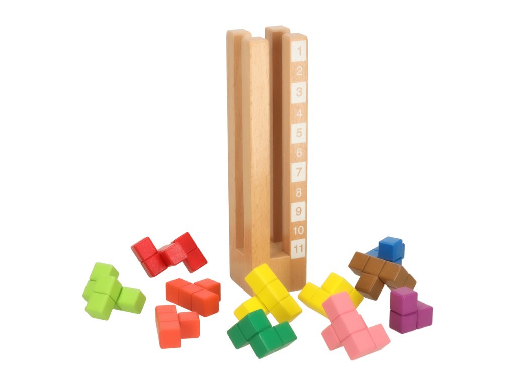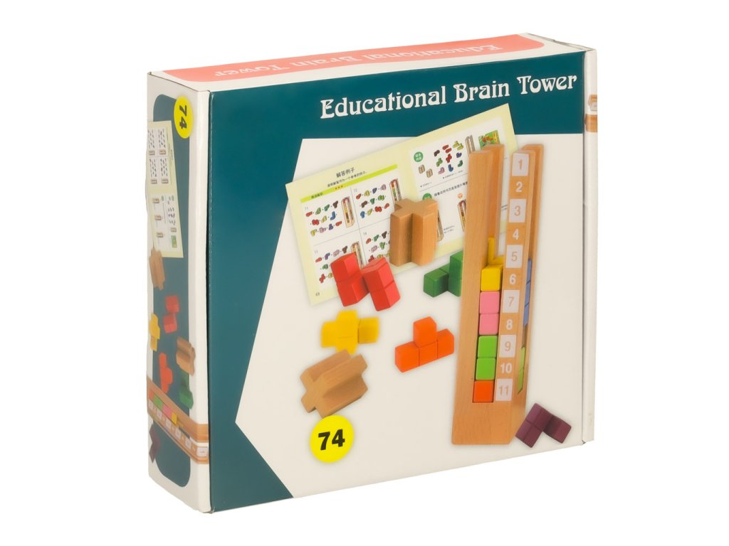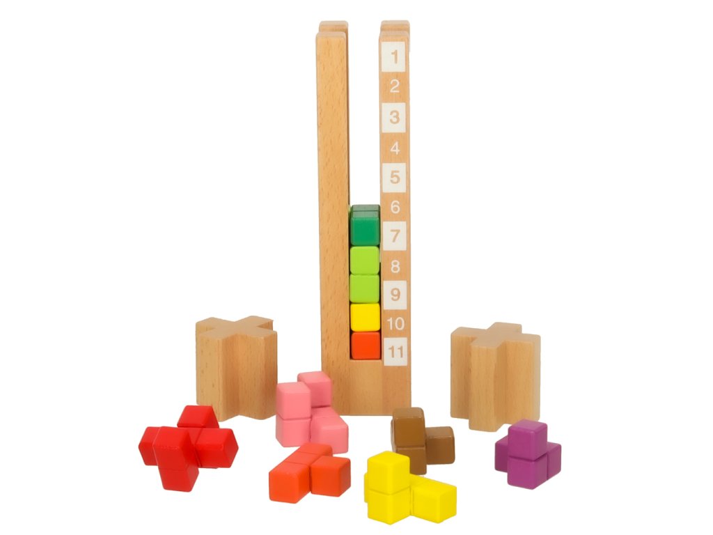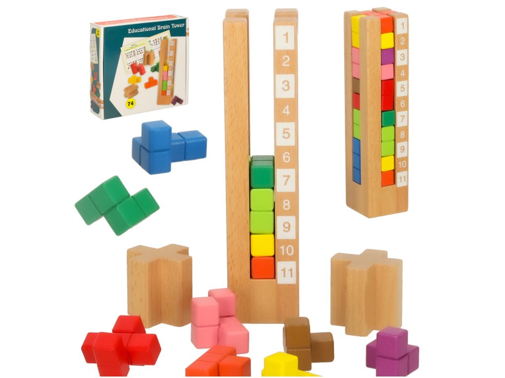 Stavebnica pre deti od 3 rokov z kvalitného dreva. Obsahuje 11 farebných blokov, základňu a 2 kocky. Rozmery veže: 4,5 cm x 4,5 cm x 20 cm. Rozmery balenia: 21 cm x 22,5 cm x 6 cm.