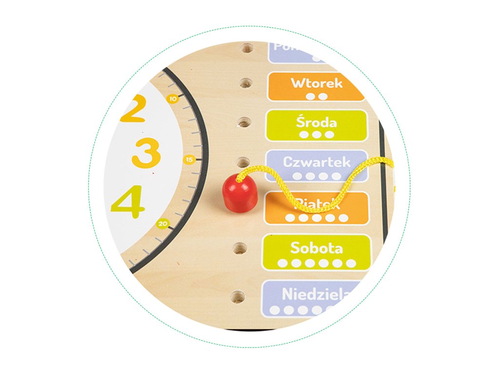 Na spoznávanie dní v týždni, ich poradia a počtu dní v mesiaci sa používajú tieto informáciešpeciálne polia s názvami dní. Pomocou šnúrky, ktorá je zakončená dreveným "špendlíkom", si batoľa môže označiť konkrétne dnivložením kolíka do príslušného otvoru.