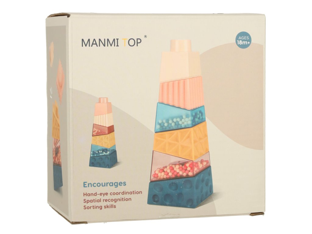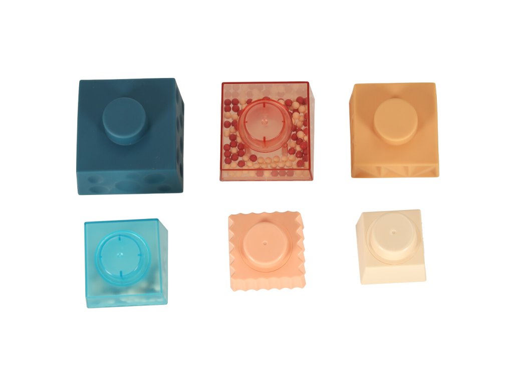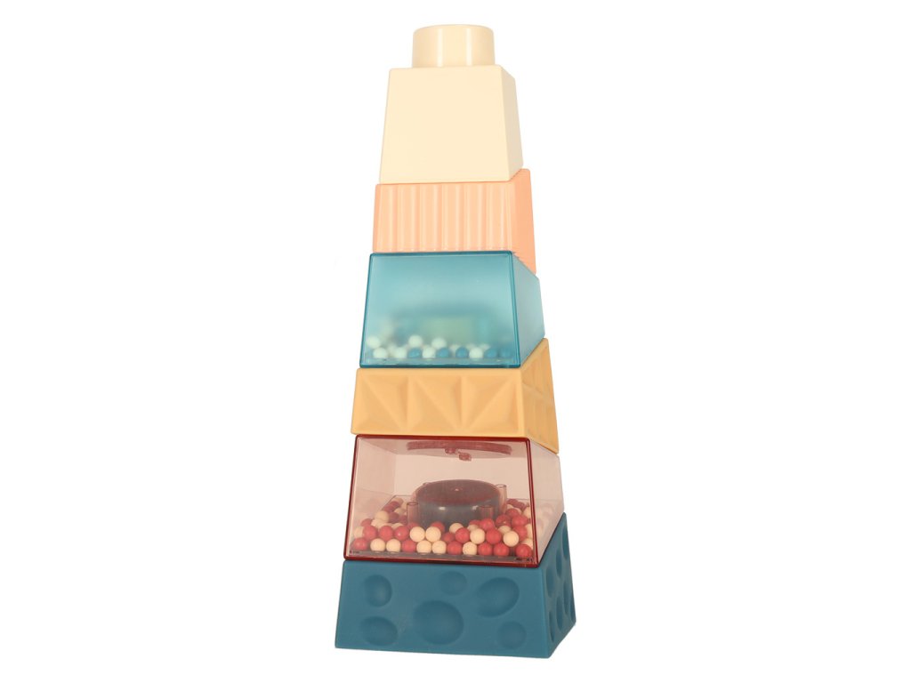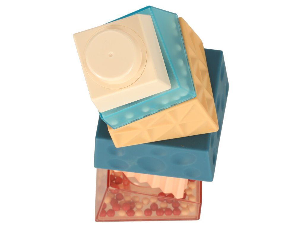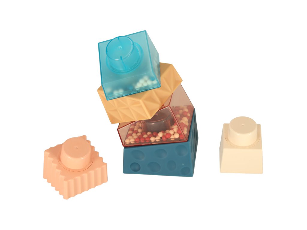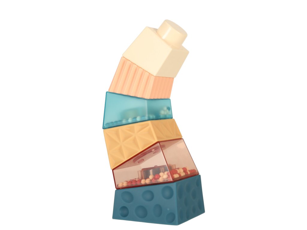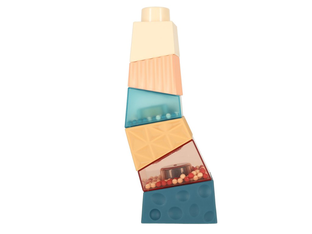 Každý blok je iný - dva z blokov majú uprostred guľôčky, ktoré sa počas hry sypú, a ostatné bloky majú rôzne textúry. Vďaka rôznorodým farbám a textúram bude hračka výborným vizuálnym a hmatovým simulátorom.