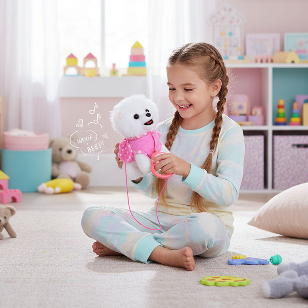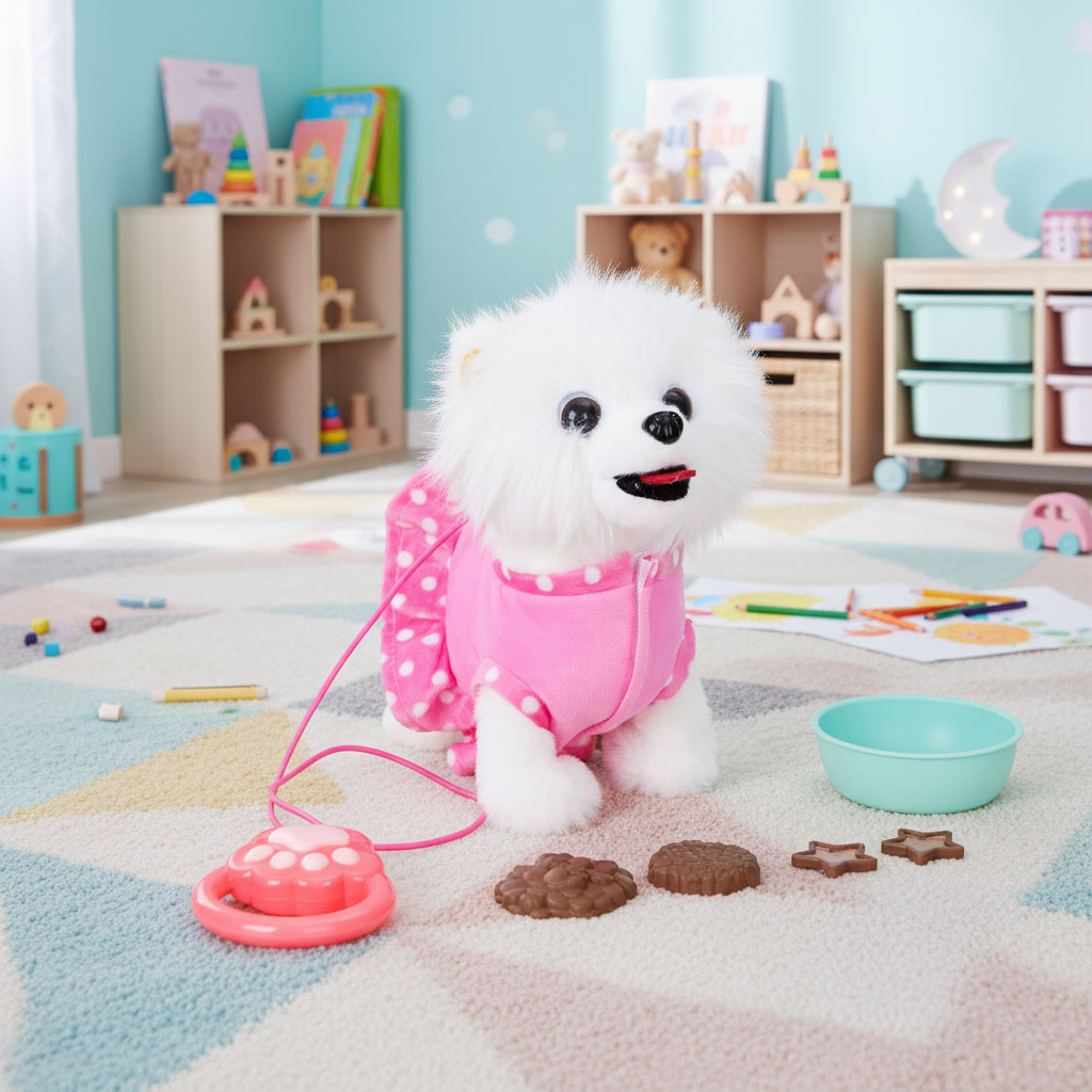 Každé dieťa chce mať svoje vlastné rozkošné zvieratkoa interaktívny pes na vodítku túto úlohu dokonale plní a od prvej chvíle priťahuje pozornosť. Je to dokonalý kamarát na hranie, ktorýučí najmenšie deti, čo je to starostlivosť, odhodlanie a zodpovednosť.Vďaka realistickým reakciám - chôdzi, vrteniu chvostom a priateľským zvukom - sa dieťa prirodzene vžije do úlohy opatrovateľa,rozvíjanie empatie a vytváranie návykov každodennej starostlivosti. Priložené príslušenstvo, ako napríklad miska, jedlo a sušienky, inšpiruje k tvorivej hre ahranie rolí, a zároveň podporuje rozvoj manuálnych zručností.