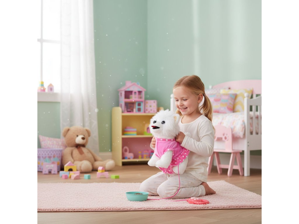 Každé dieťa chce mať svoje vlastné rozkošné zvieratko a interaktívny pes na vodítku túto úlohu dokonale plní a od prvej chvíle priťahuje pozornosť. Je to dokonalý kamarát na hranie, ktorý učí najmenšie deti, čo je to starostlivosť, odhodlanie a zodpovednosť. Vďaka realistickým reakciám - chôdzi, vrteniu chvostom a priateľským zvukom - sa dieťa prirodzene vžije do úlohy opatrovateľa, rozvíjanie empatie a vytváranie návykov každodennej starostlivosti. Priložené príslušenstvo, ako napríklad miska, jedlo a sušienky, inšpiruje k tvorivej hre a hranie rolí, a zároveň podporuje rozvoj manuálnych zručností.