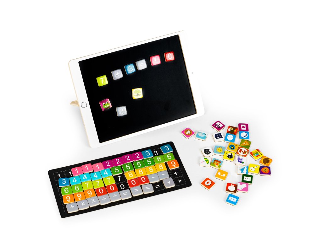 Magnetická drevená tabletaje inovatívna vzdelávacia hračka určená na rozvoj matematických a kognitívnych schopností detí. Súprava obsahuje55 magnetických štvorcov s číslami a matematickými symbolmi, ktorý umožňuje deťom vykonávať jednoduché matematické operácie.Okrem toho sada obsahuje 30 magnetických obrázkov, čím sa batoľatám otvára možnosť vytvárať farebné a kreatívne vzory.